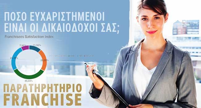 Το ΠΑΡΑΤΗΡΗΤΗΡΙΟ FRANCHISE, ο μόνιμος μηχανισμός παρακολούθησης και ανάλυσης του franchising στην Ελλάδα, υπό την αιγίδα του FRANCHISE BUSINESS, και με τη συνδρομή του Franchise.GR παρουσιάζει την ανάλυση από την πρόσφατη έρευνα που διεξάγαγε αναφορικά με τον βαθμό ικανοποίησης των δικαιοδόχων στην Ελλάδα (F.S.I. - Franchisees Satisfaction Index), σύμφωνα με την οποία το 67,11% των δικαιοδόχων να δηλώνουν ικανοποιημένοι από «Αρκετά» έως «Πάρα Πολύ».