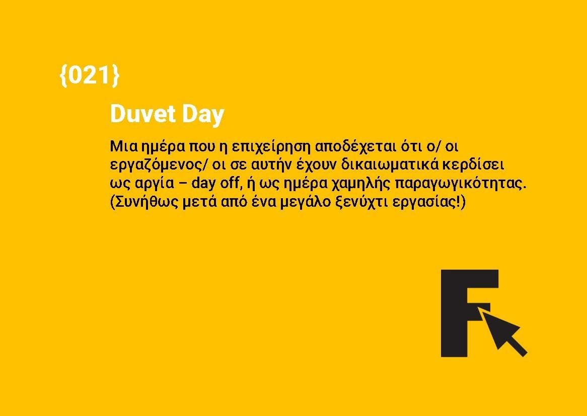 Μια ημέρα που η επιχείρηση αποδέχεται ότι ο/ οι εργαζόμενος/ οι σε αυτήν έχουν δικαιωματικά κερδίσει ως αργία – day off, ή ως ημέρα χαμηλής παραγωγικότητας. (Συνήθως μετά από ένα μεγάλο ξενύχτι εργασίας!)
